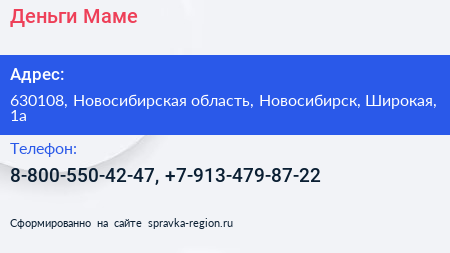 Деньги Маме по адресу 630108, Новосибирская область, Новосибирск, Широкая, 1а в дальнейшем Организация, размещена в следующих категориях: