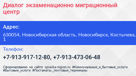 Диалог, экзаменационно-миграционный центр по адресу 630054, Новосибирская область, Новосибирск, Костычева, 1 в дальнейшем Организация, размещена в следующих категориях: