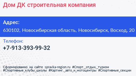 Дом ДК, строительная компания по адресу 630102, Новосибирская область, Новосибирск, Восход, 20 в дальнейшем Организация, размещена в следующих категориях: