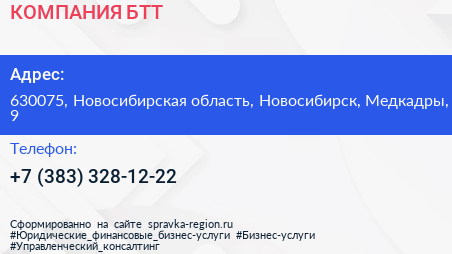 КОМПАНИЯ БТТ по адресу 630075, Новосибирская область, Новосибирск, Медкадры, 9 в дальнейшем Организация, размещена в следующих категориях: