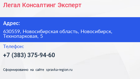 Легал Консалтинг Эксперт по адресу 630559, Новосибирская область, Новосибирск, Технопарковая, 5 в дальнейшем Организация, размещена в следующих категориях: