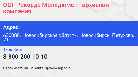 ОСГ Рекордз Менеджмент, архивная компания по адресу 630088, Новосибирская область, Новосибирск, Петухова, 71 в дальнейшем Организация, размещена в следующих категориях: