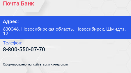 Почта Банк по адресу 630046, Новосибирская область, Новосибирск, Шмидта, 12 в дальнейшем Организация, размещена в следующих категориях: