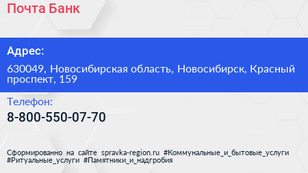 Почта Банк по адресу 630049, Новосибирская область, Новосибирск, Красный проспект, 159 в дальнейшем Организация, размещена в следующих категориях: