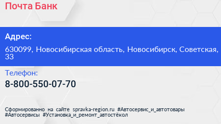 Почта Банк по адресу 630099, Новосибирская область, Новосибирск, Советская, 33 в дальнейшем Организация, размещена в следующих категориях: