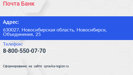 Почта Банк по адресу 630027, Новосибирская область, Новосибирск, Объединения, 25 в дальнейшем Организация, размещена в следующих категориях: