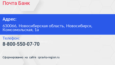 Почта Банк по адресу 630066, Новосибирская область, Новосибирск, Комсомольская, 1а в дальнейшем Организация, размещена в следующих категориях: