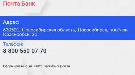 Почта Банк по адресу 630501, Новосибирская область, Новосибирск, посёлок Краснообск, 20 в дальнейшем Организация, размещена в следующих категориях:
