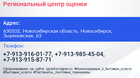 Региональный центр оценки по адресу 630102, Новосибирская область, Новосибирск, Зыряновская, 63 в дальнейшем Организация, размещена в следующих категориях: