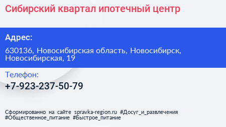 Сибирский квартал, ипотечный центр по адресу 630136, Новосибирская область, Новосибирск, Новосибирская, 19 в дальнейшем Организация, размещена в следующих категориях: