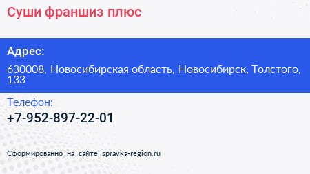 Суши франшиз плюс по адресу 630008, Новосибирская область, Новосибирск, Толстого, 133 в дальнейшем Организация, размещена в следующих категориях: