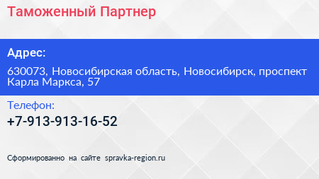 Таможенный Партнер по адресу 630073, Новосибирская область, Новосибирск, проспект Карла Маркса, 57 в дальнейшем Организация, размещена в следующих категориях: