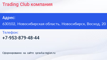 Trading Club, компания по адресу 630102, Новосибирская область, Новосибирск, Восход, 20 в дальнейшем Организация, размещена в следующих категориях: