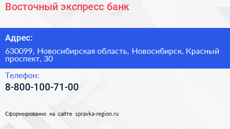Восточный экспресс банк по адресу 630099, Новосибирская область, Новосибирск, Красный проспект, 30 в дальнейшем Организация, размещена в следующих категориях: