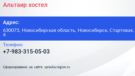 Альтаир, хостел по адресу 630073, Новосибирская область, Новосибирск, Стартовая, 4 в дальнейшем Организация, размещена в следующих категориях: