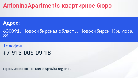 AntoninaApartments, квартирное бюро по адресу 630091, Новосибирская область, Новосибирск, Крылова, 34 в дальнейшем Организация, размещена в следующих категориях: