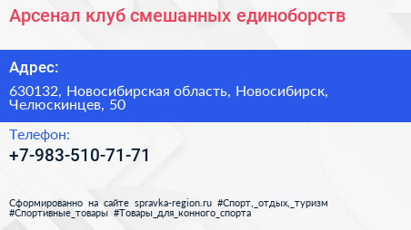 Арсенал, клуб смешанных единоборств по адресу 630132, Новосибирская область, Новосибирск, Челюскинцев, 50 в дальнейшем Организация, размещена в следующих категориях: