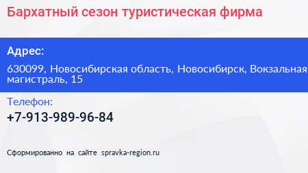 Бархатный сезон, туристическая фирма по адресу 630099, Новосибирская область, Новосибирск, Вокзальная магистраль, 15 в дальнейшем Организация, размещена в следующих категориях:
