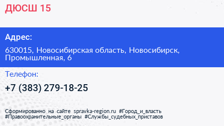 ДЮСШ №15 по адресу 630015, Новосибирская область, Новосибирск, Промышленная, 6 в дальнейшем Организация, размещена в следующих категориях: