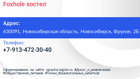 Foxhole, хостел по адресу 630091, Новосибирская область, Новосибирск, Фрунзе, 2Б в дальнейшем Организация, размещена в следующих категориях: