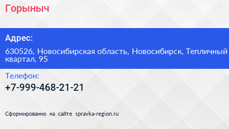 Горыныч по адресу 630526, Новосибирская область, Новосибирск, Тепличный квартал, 95 в дальнейшем Организация, размещена в следующих категориях: