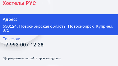 Хостелы РУС по адресу 630124, Новосибирская область, Новосибирск, Куприна, 8/1 в дальнейшем Организация, размещена в следующих категориях: