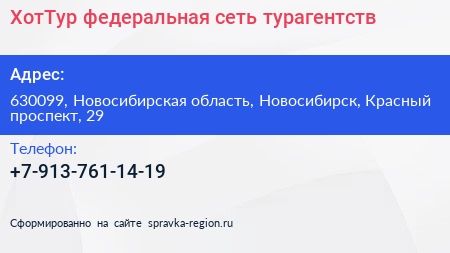 ХотТур, федеральная сеть турагентств по адресу 630099, Новосибирская область, Новосибирск, Красный проспект, 29 в дальнейшем Организация, размещена в следующих категориях: