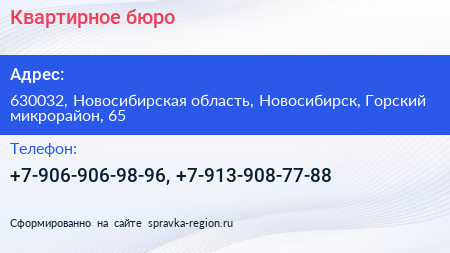 Квартирное бюро по адресу 630032, Новосибирская область, Новосибирск, Горский микрорайон, 65 в дальнейшем Организация, размещена в следующих категориях: