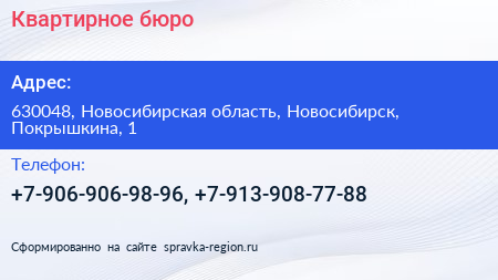 Квартирное бюро по адресу 630048, Новосибирская область, Новосибирск, Покрышкина, 1 в дальнейшем Организация, размещена в следующих категориях: