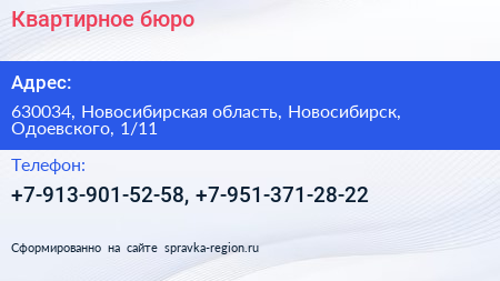 Квартирное бюро по адресу 630034, Новосибирская область, Новосибирск, Одоевского, 1/11 в дальнейшем Организация, размещена в следующих категориях: