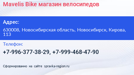 Mavelis Bike, магазин велосипедов по адресу 630008, Новосибирская область, Новосибирск, Кирова, 113 в дальнейшем Организация, размещена в следующих категориях: