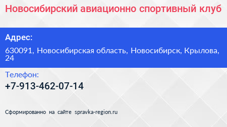 Новосибирский авиационно-спортивный клуб по адресу 630091, Новосибирская область, Новосибирск, Крылова, 24 в дальнейшем Организация, размещена в следующих категориях: