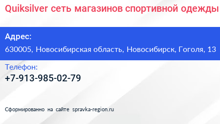 Quiksilver, сеть магазинов спортивной одежды по адресу 630005, Новосибирская область, Новосибирск, Гоголя, 13 в дальнейшем Организация, размещена в следующих категориях: