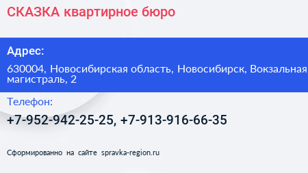 СКАЗКА, квартирное бюро по адресу 630004, Новосибирская область, Новосибирск, Вокзальная магистраль, 2 в дальнейшем Организация, размещена в следующих категориях: