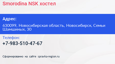 Smorodina-NSK, хостел по адресу 630099, Новосибирская область, Новосибирск, Семьи Шамшиных, 30 в дальнейшем Организация, размещена в следующих категориях: