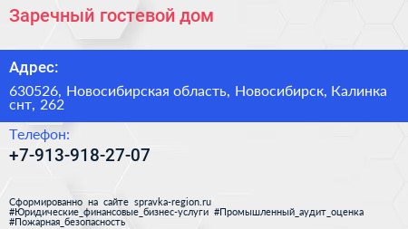 Заречный, гостевой дом по адресу 630526, Новосибирская область, Новосибирск, Калинка снт, 262 в дальнейшем Организация, размещена в следующих категориях: