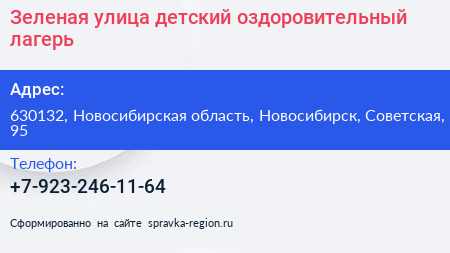 Зеленая улица, детский оздоровительный лагерь по адресу 630132, Новосибирская область, Новосибирск, Советская, 95 в дальнейшем Организация, размещена в следующих категориях: