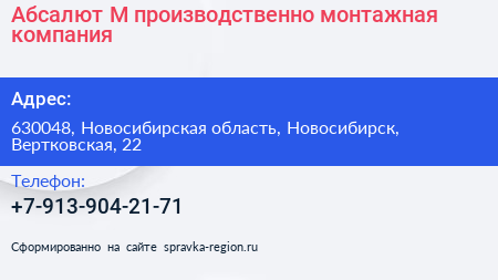 Абсалют-М, производственно-монтажная компания по адресу 630048, Новосибирская область, Новосибирск, Вертковская, 22 в дальнейшем Организация, размещена в следующих категориях: