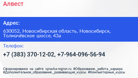 Алвест по адресу 630052, Новосибирская область, Новосибирск, Толмачёвское шоссе, 43а в дальнейшем Организация, размещена в следующих категориях: