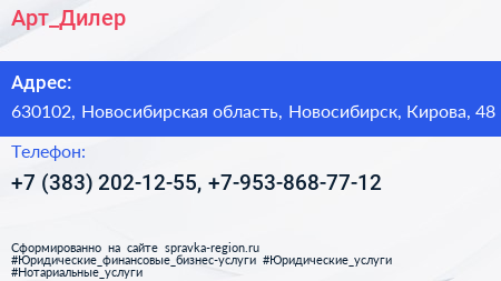 Арт_Дилер по адресу 630102, Новосибирская область, Новосибирск, Кирова, 48 в дальнейшем Организация, размещена в следующих категориях: