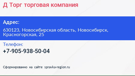 Д-Торг, торговая компания по адресу 630123, Новосибирская область, Новосибирск, Красногорская, 25 в дальнейшем Организация, размещена в следующих категориях: