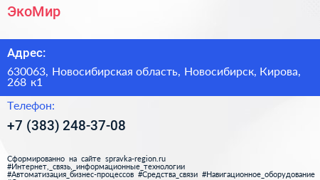 ЭкоМир по адресу 630063, Новосибирская область, Новосибирск, Кирова, 268 к1 в дальнейшем Организация, размещена в следующих категориях:
