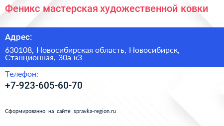 Феникс, мастерская художественной ковки по адресу 630108, Новосибирская область, Новосибирск, Станционная, 30а к3 в дальнейшем Организация, размещена в следующих категориях: