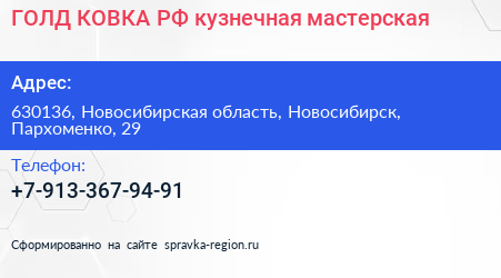ГОЛД-КОВКА.РФ, кузнечная мастерская по адресу 630136, Новосибирская область, Новосибирск, Пархоменко, 29 в дальнейшем Организация, размещена в следующих категориях: