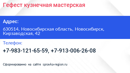 Гефест, кузнечная мастерская по адресу 630514, Новосибирская область, Новосибирск, Кирзаводская, 42 в дальнейшем Организация, размещена в следующих категориях: