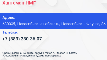 Хантсман-НМГ по адресу 630005, Новосибирская область, Новосибирск, Фрунзе, 86 в дальнейшем Организация, размещена в следующих категориях: