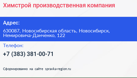 Химстрой, производственная компания по адресу 630087, Новосибирская область, Новосибирск, Немировича-Данченко, 122 в дальнейшем Организация, размещена в следующих категориях: