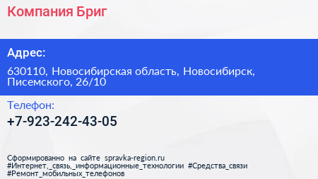 Компания Бриг по адресу 630110, Новосибирская область, Новосибирск, Писемского, 26/10 в дальнейшем Организация, размещена в следующих категориях: