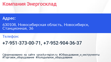 Компания Энергосклад по адресу 630108, Новосибирская область, Новосибирск, Станционная, 36 в дальнейшем Организация, размещена в следующих категориях: