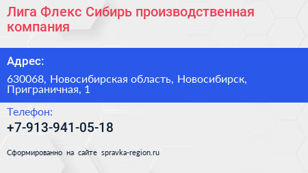 Лига-Флекс-Сибирь, производственная компания по адресу 630068, Новосибирская область, Новосибирск, Приграничная, 1 в дальнейшем Организация, размещена в следующих категориях: